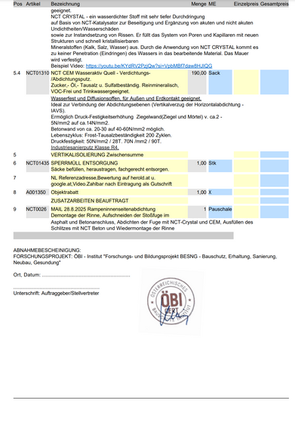 Die Baufirma NCT hat eine Sanierung einer Tiefgarage in 1160 Wien durchgeführt, in der es über längere Zeit zu massivem Wassereintritt gekommen war. Aufgrund dieser geringen Schichtdicke trat bereits kurz nach Inbetriebnahme des Gebäudes Feuchtigkeit auf.